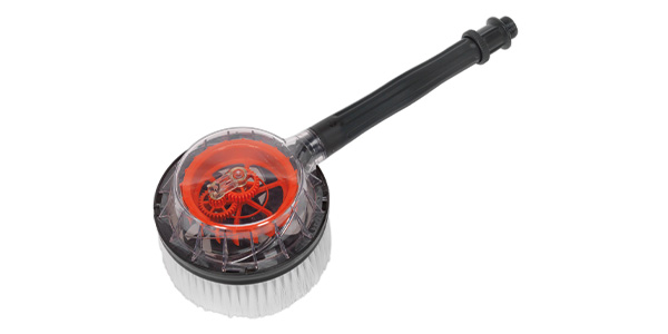 The inner brush is propelled via water flow while the fixed brush on the outside prevents excess water spray.
